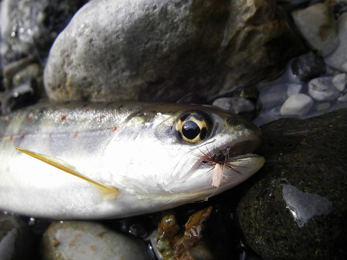 早い流れの脇やちょっとした深みのある淡い流れの部分などかなりポイントが限られる。