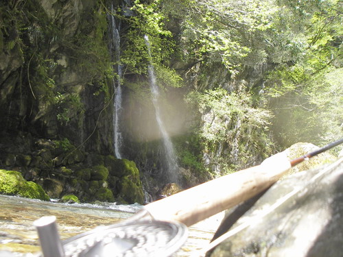 フライ先行でそっと流れの中にフライを落とす。レーンに乗ってドンピシャ!キャスティンヘタの私にしては珍し。